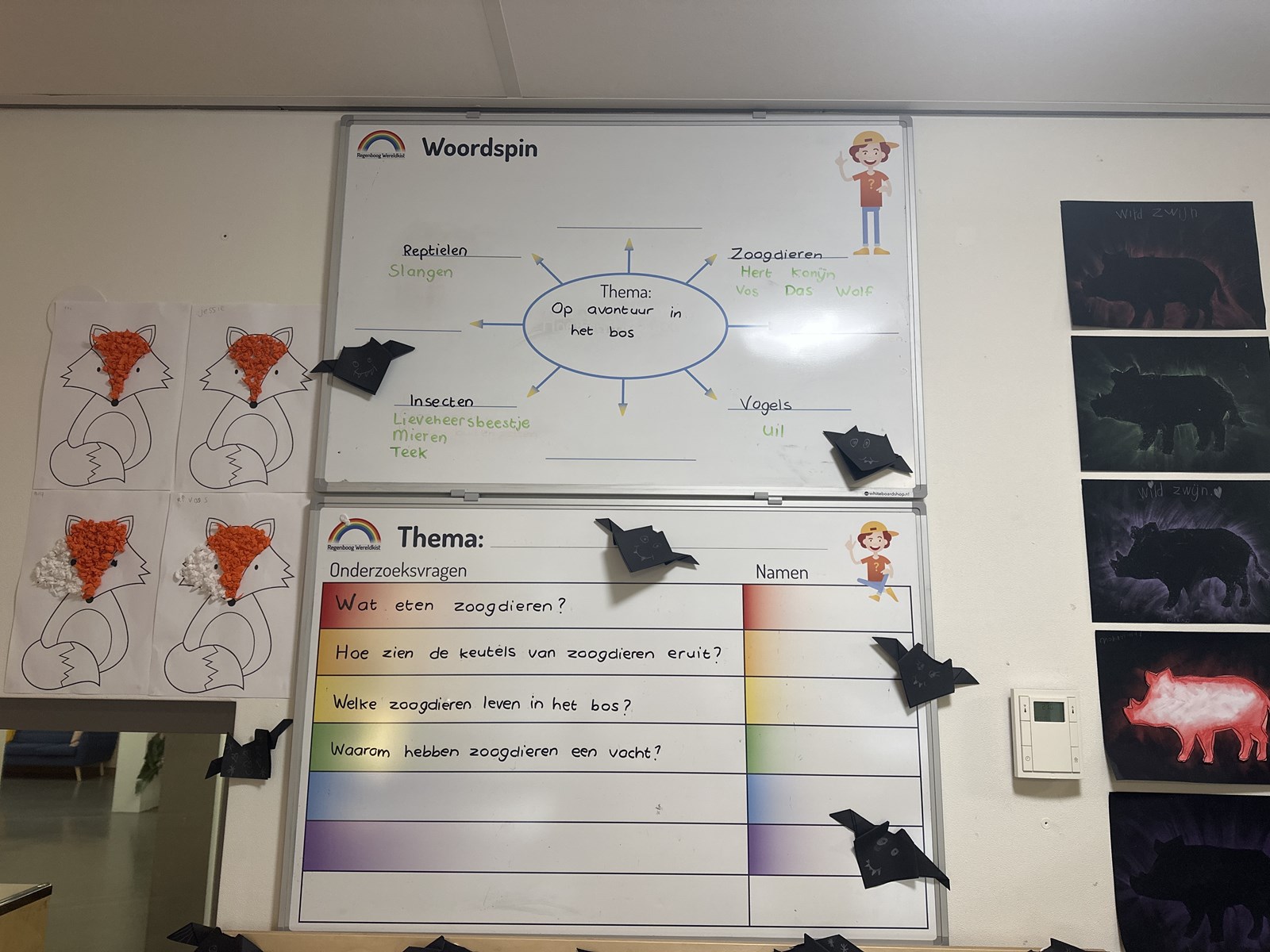 De groepen 3 en 4 hebben dit thema geleerd wat zoogdieren zijn. Over de ree, das, eekhoorn, wilde zwijn, vleermuis en de vos hebben we meer informatie opgezocht. Naast het leren van de theorie hebben we ook gespeeld. Huishoek, constructie materiaal, beebot, tekenen, kleien en knutselen van een verrekijker. De boswachter kwam ook nog op bezoek!