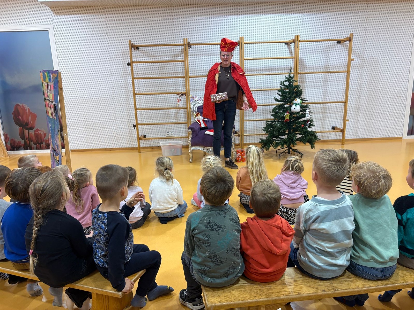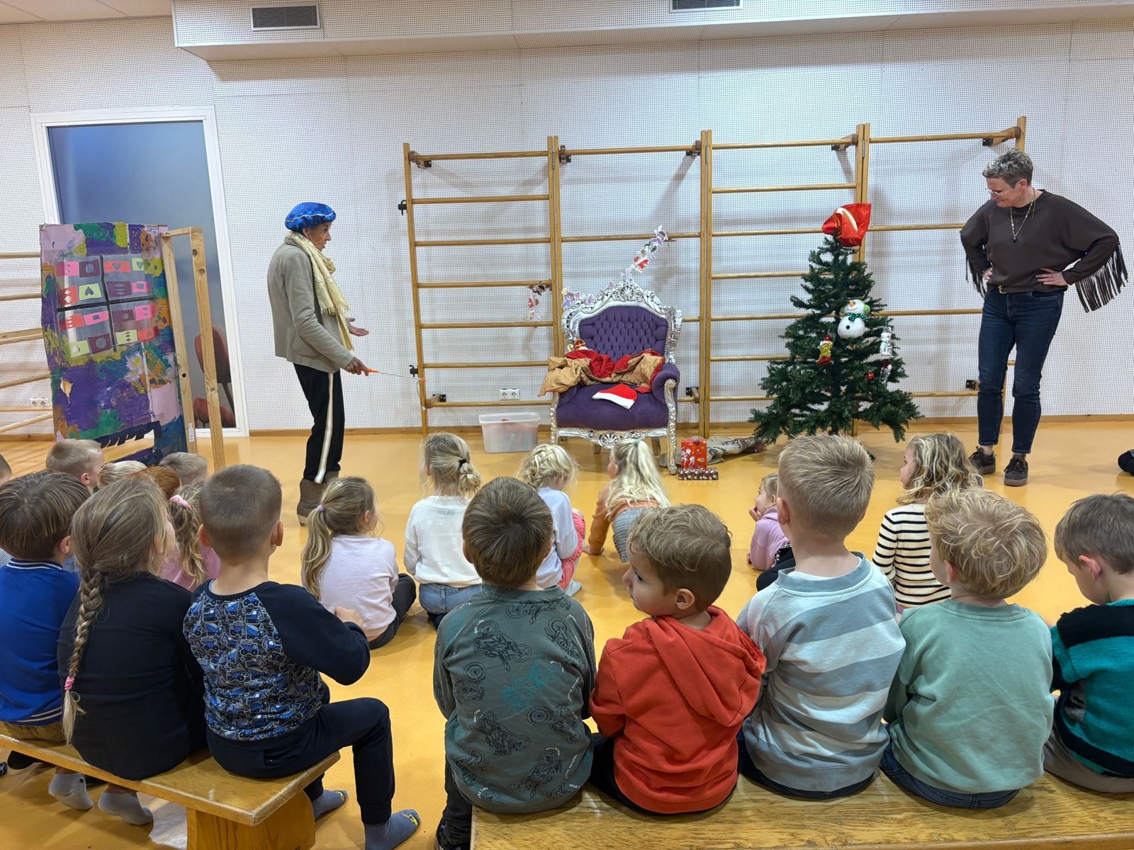 Juf Karin en juf Atie haalden alle feesten door elkaar: lampion lopen als je jarig bent, sinterklaas legt cadeautjes onder de boom...